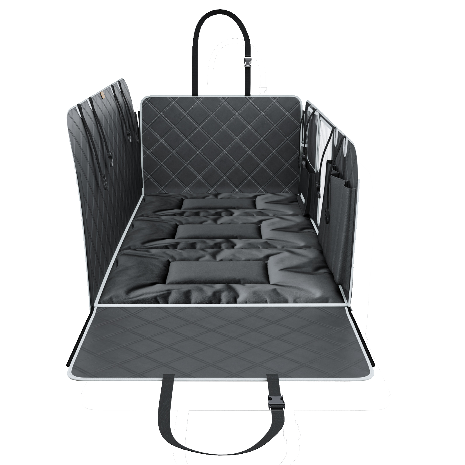 Our dog backseat extender measures 27.75“ x 52”, fitting most car backseats, SUVs, and small trucks. This provides more room for your dog to move around and stretch out, ensuring greater comfort during long trips.